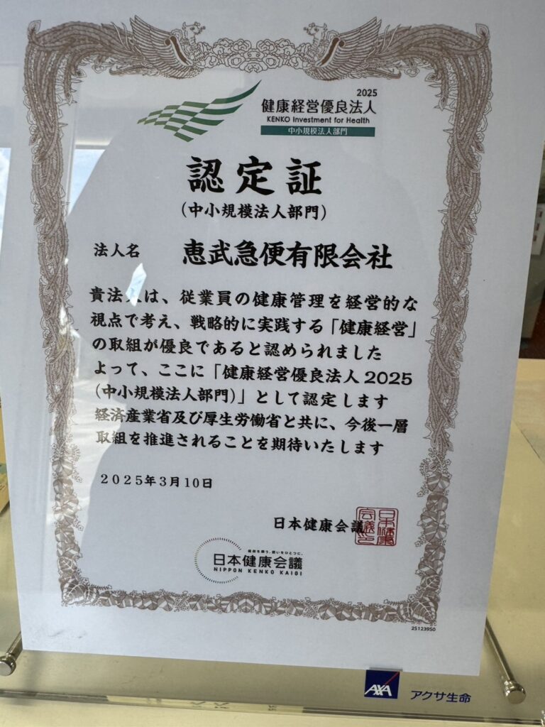 恵武急便は、**2025年度も「健康経営優良法人」**の認定を受けました。